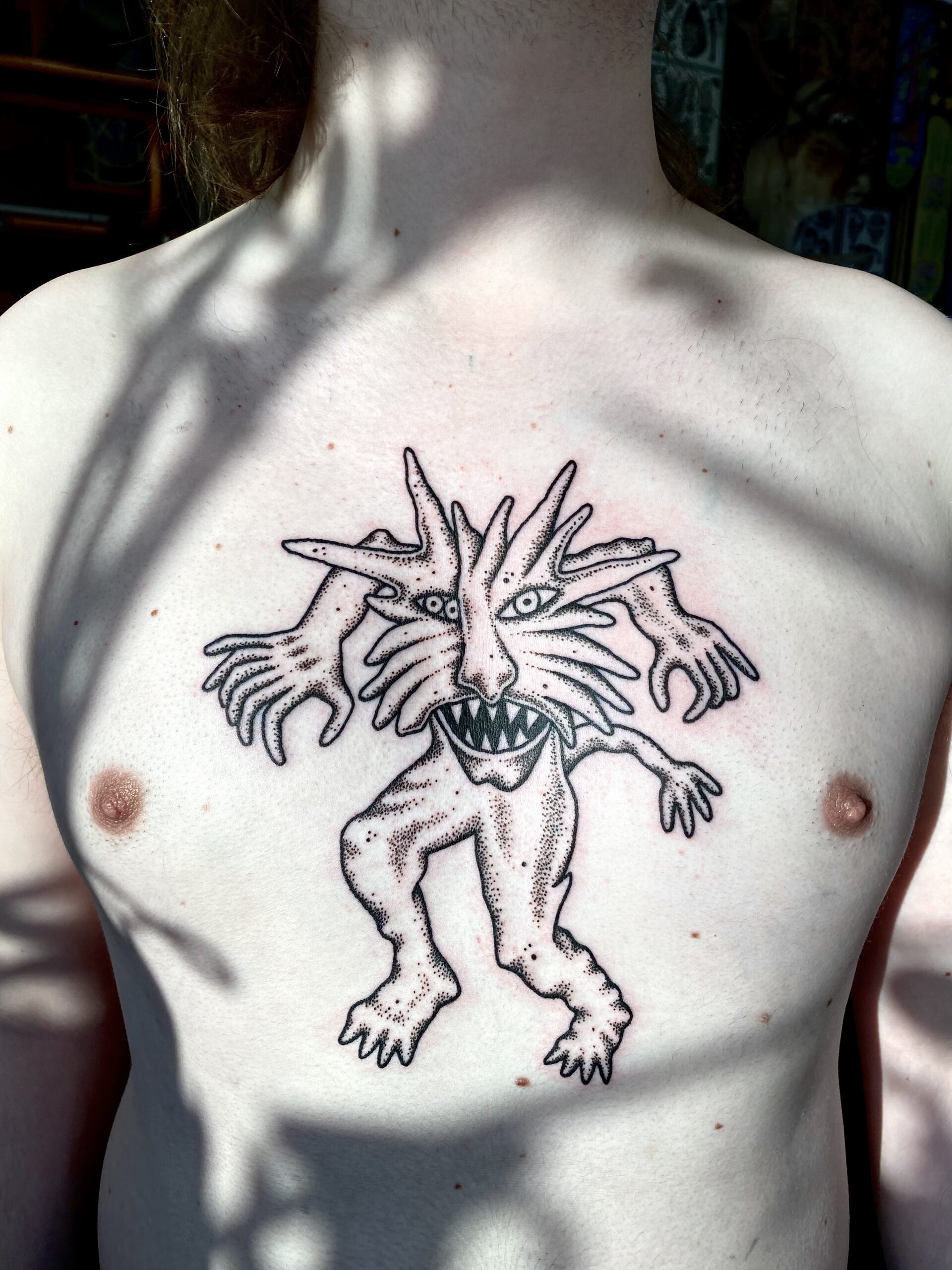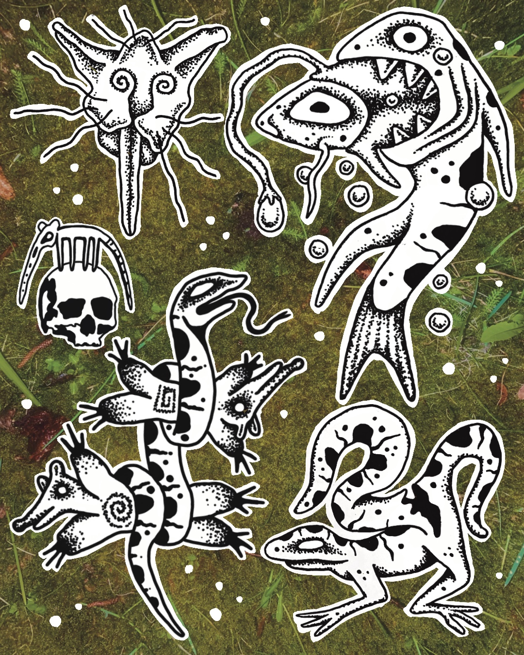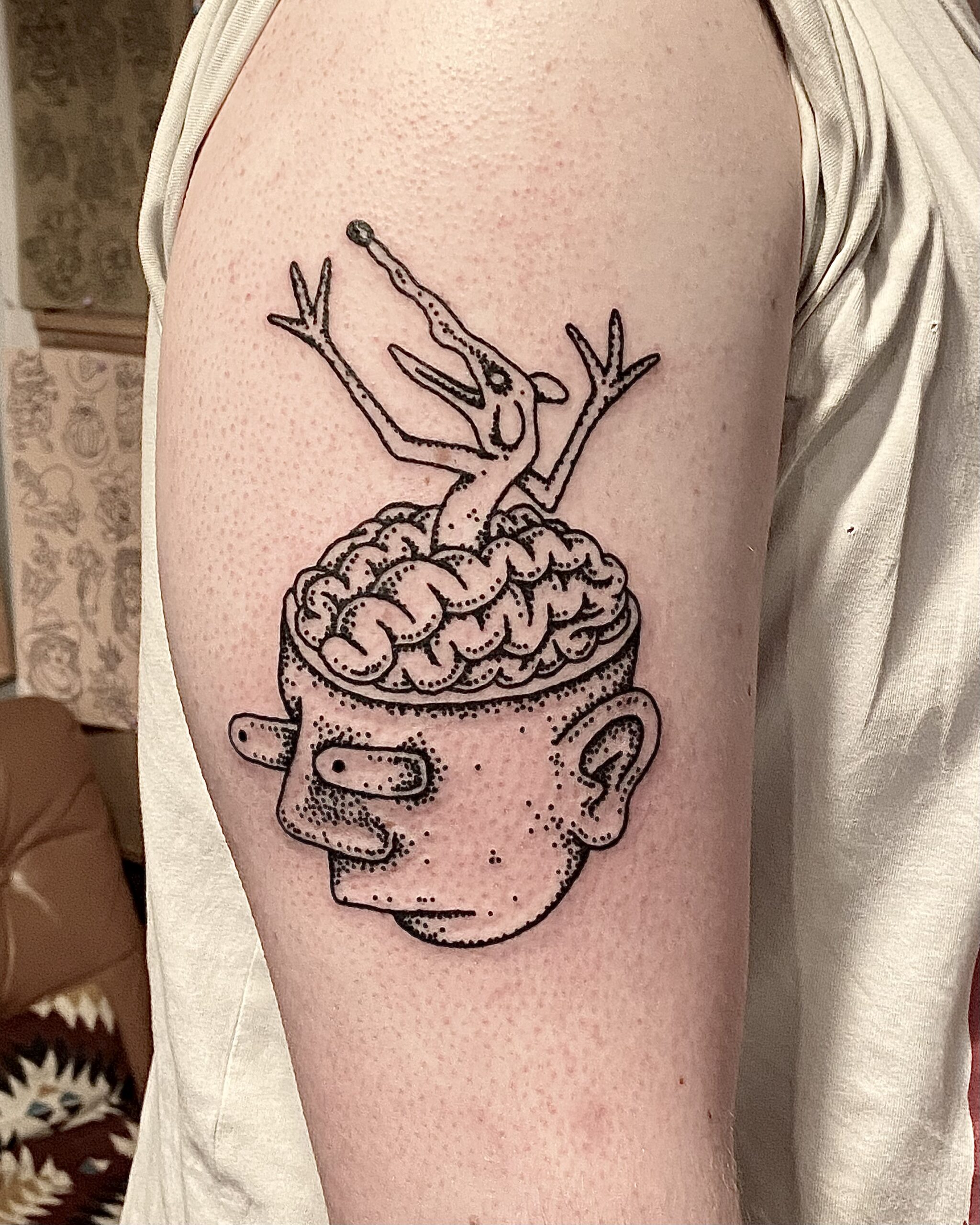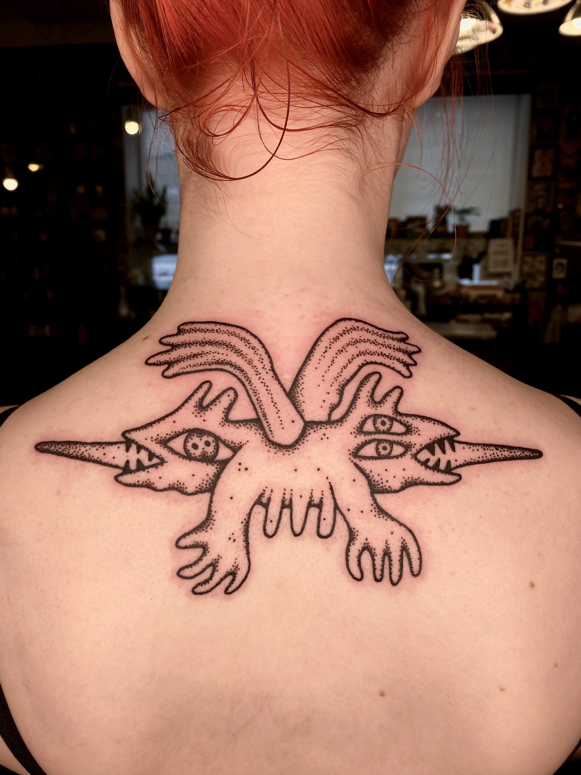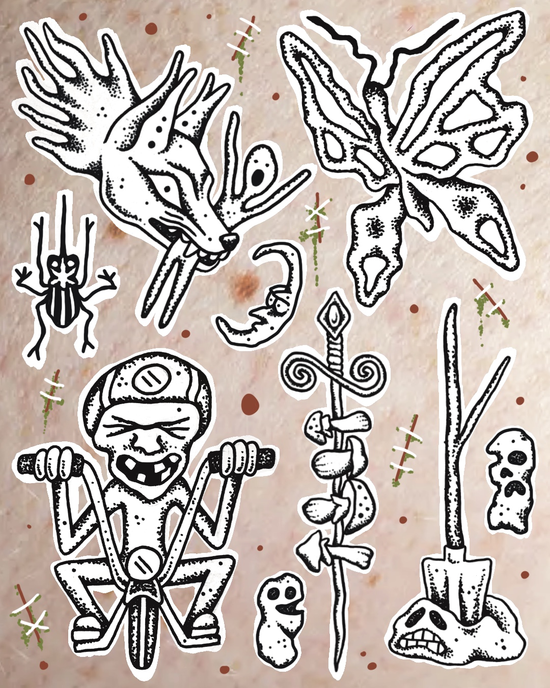 Weird and magical characters emerge from the back of my brain onto paper, where they wait for their future owner—whose skin they can start to inhabit. I also love bringing together designs based on the client’s own vision: descriptions, images, poems, band logos, memories, and memes—every idea is welcome in the creative process!