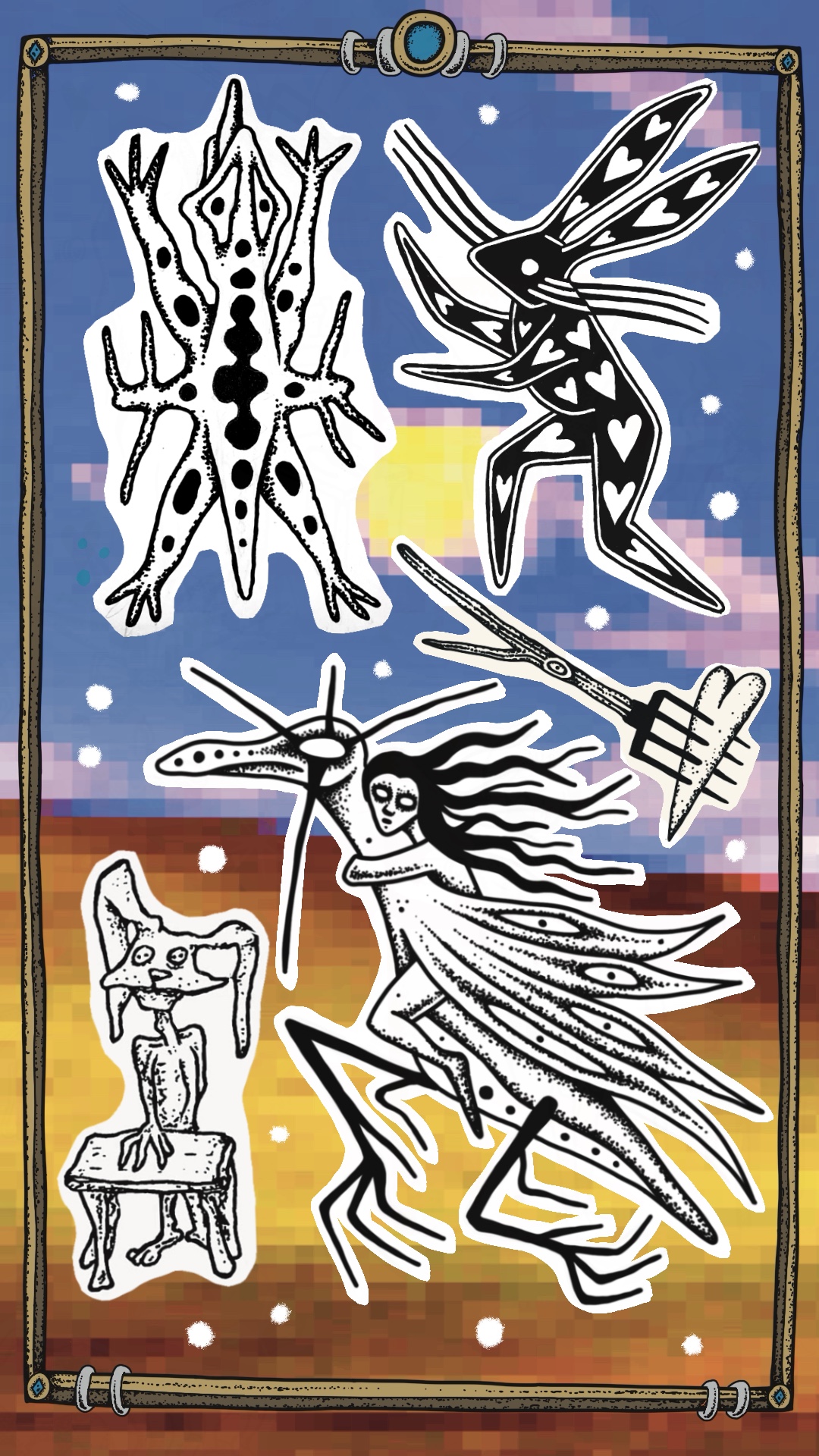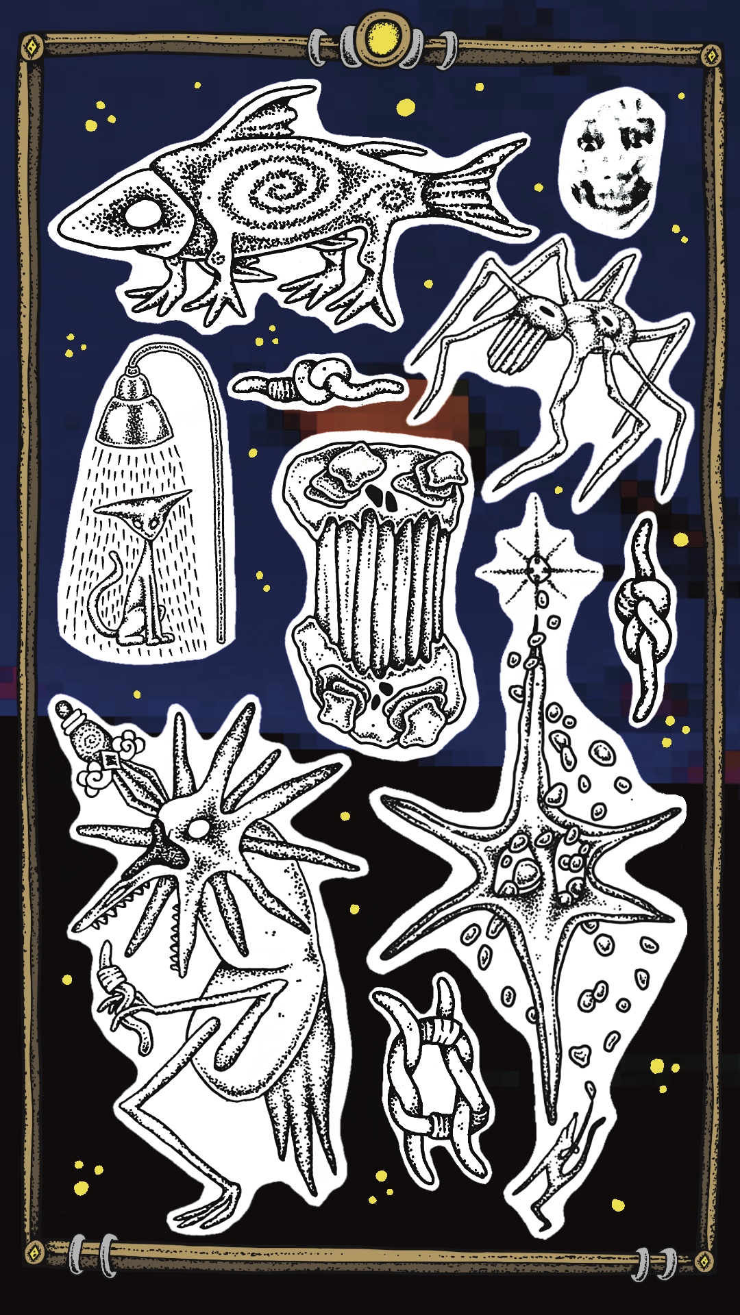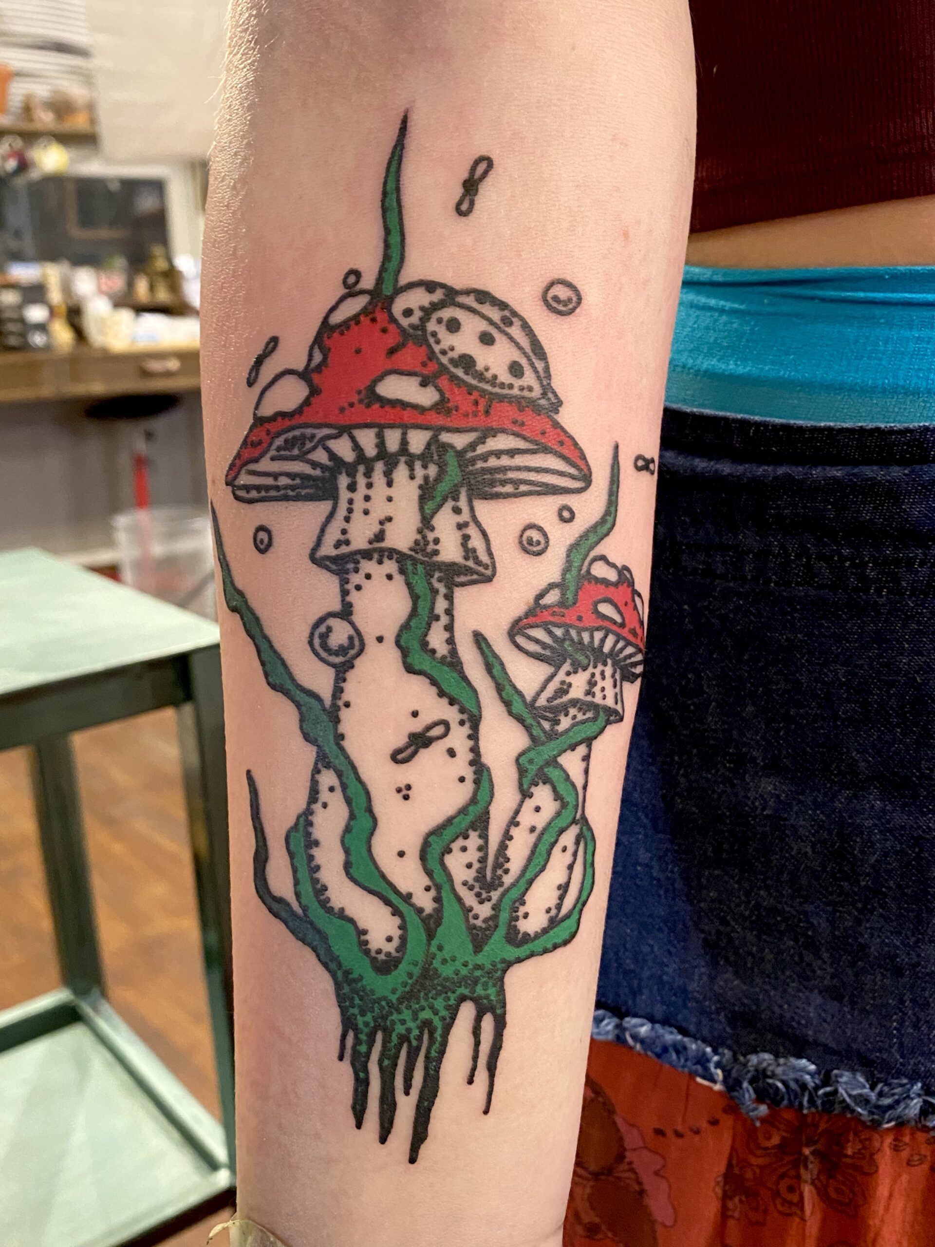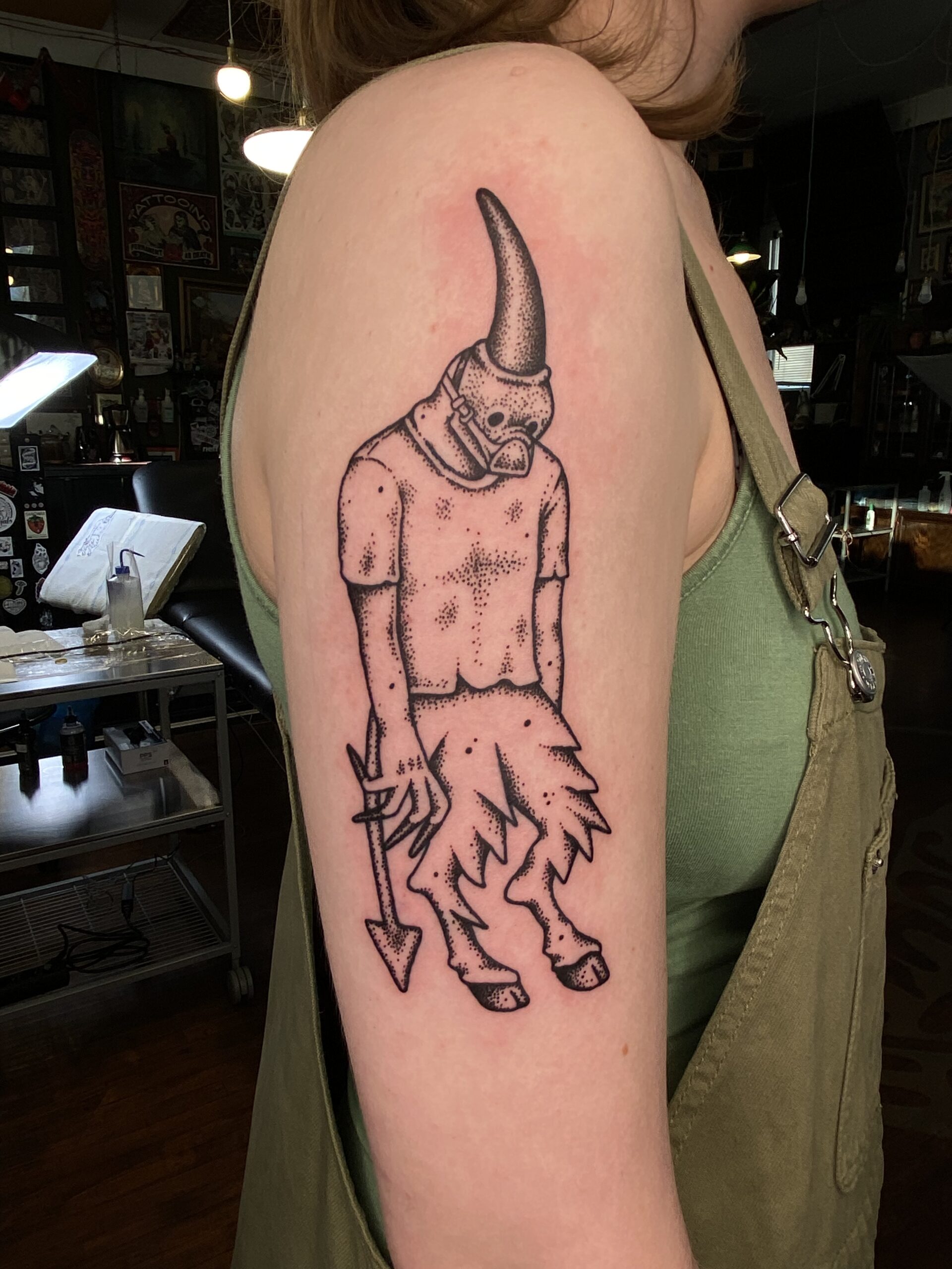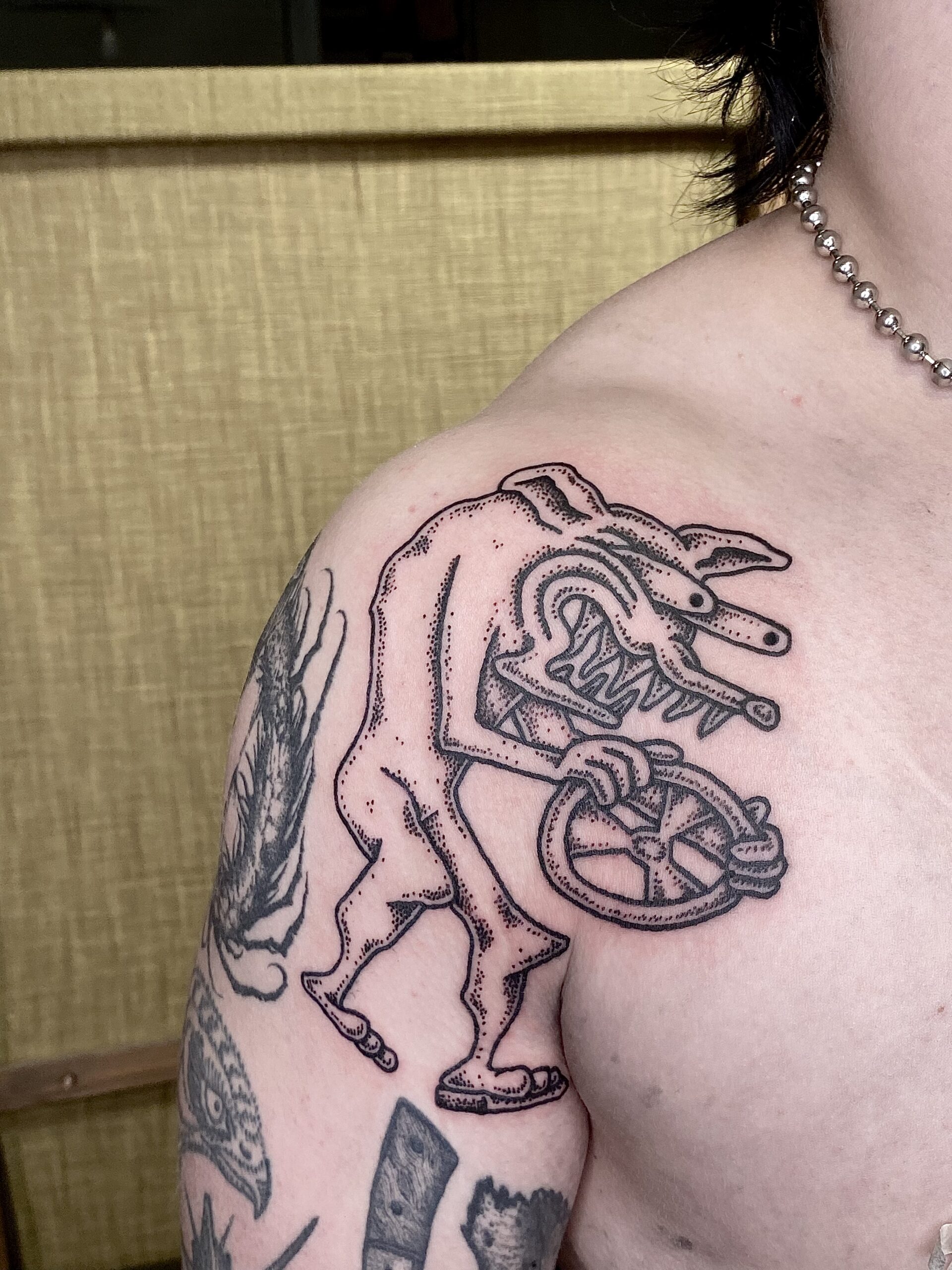 Weird and magical characters emerge from the back of my brain onto paper, where they wait for their future owner—whose skin they can start to inhabit. I also love bringing together designs based on the client’s own vision: descriptions, images, poems, band logos, memories, and memes—every idea is welcome in the creative process!