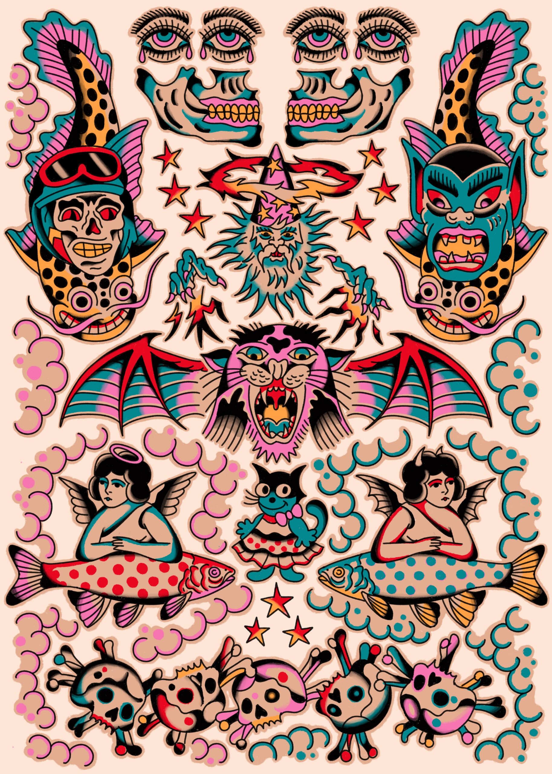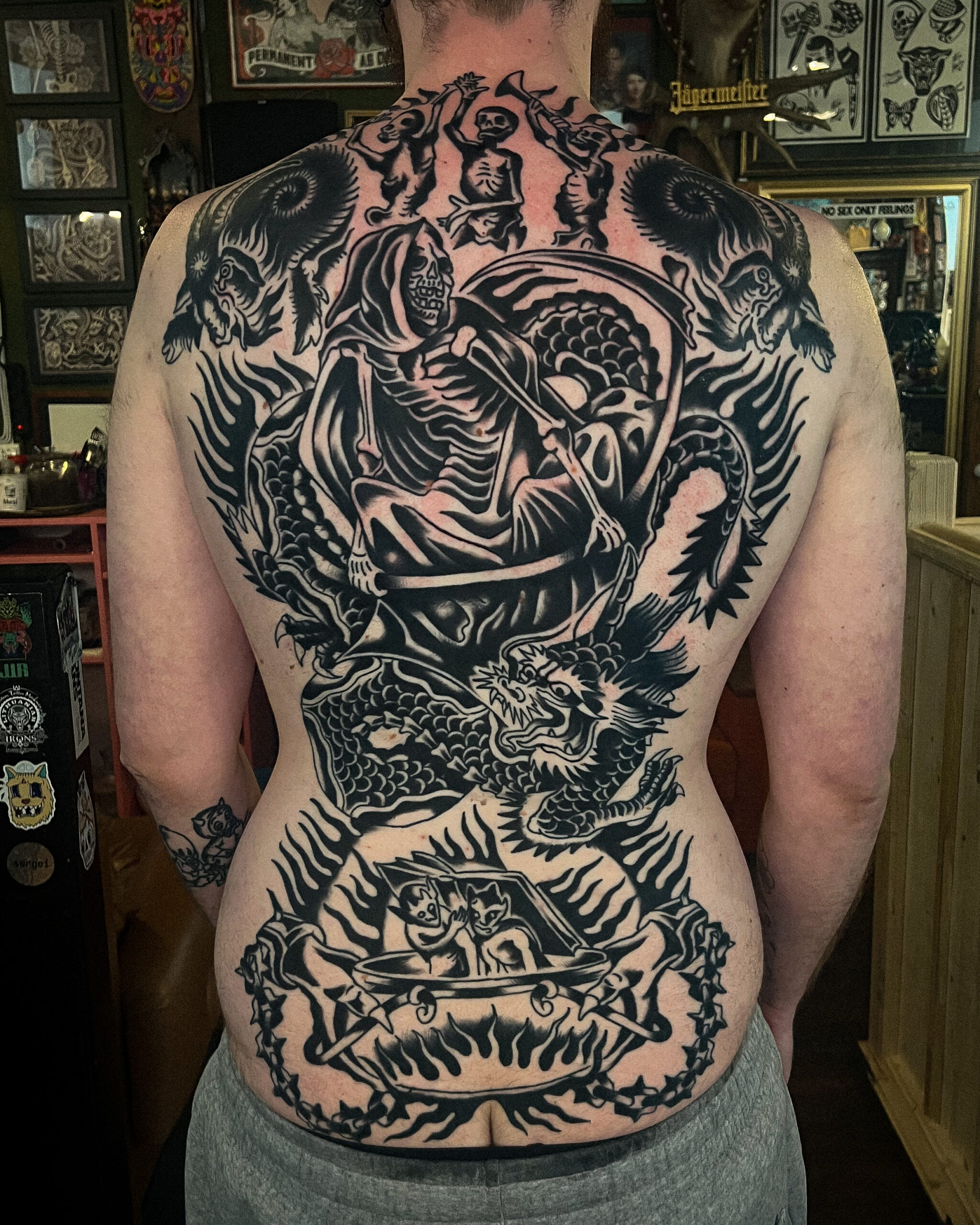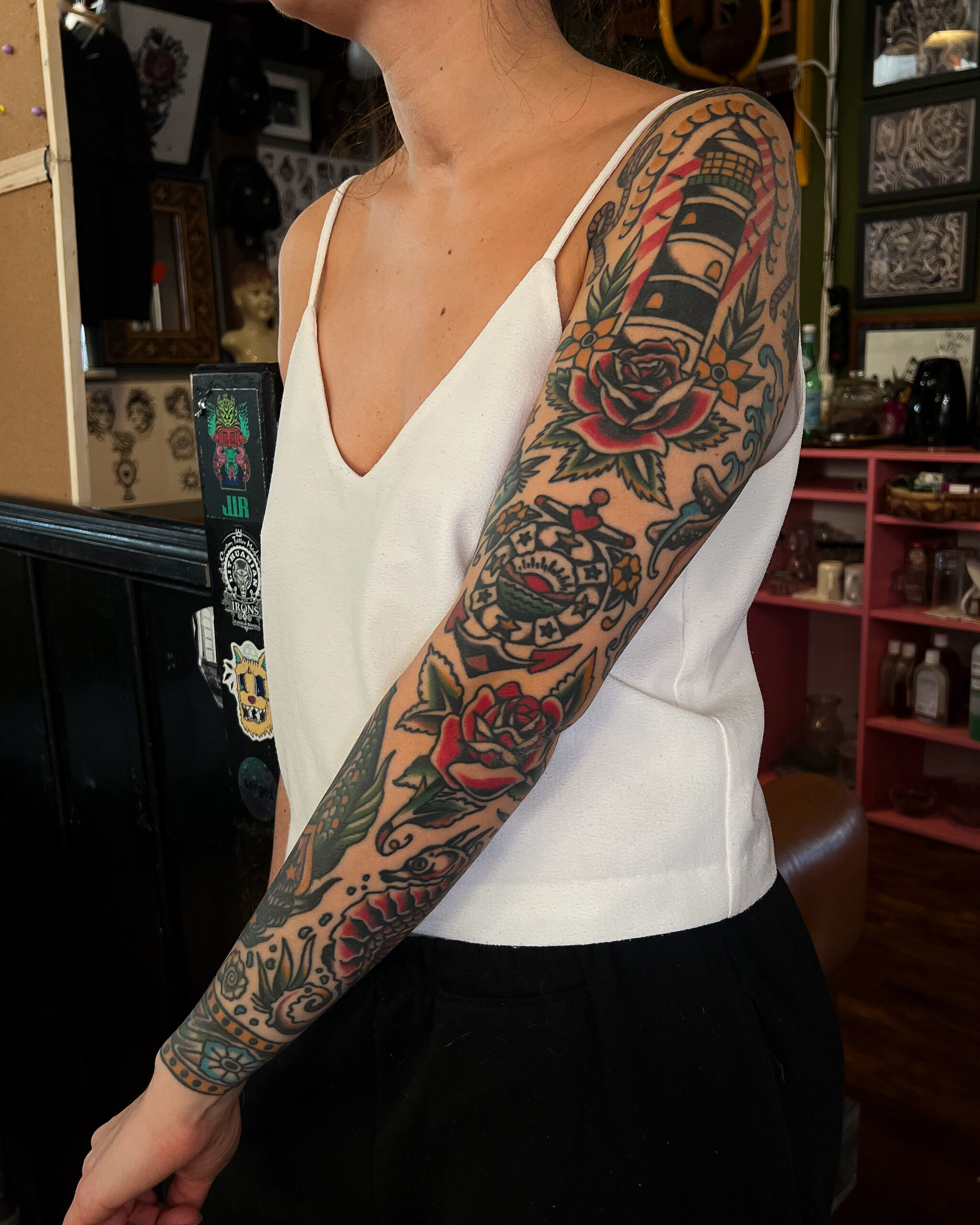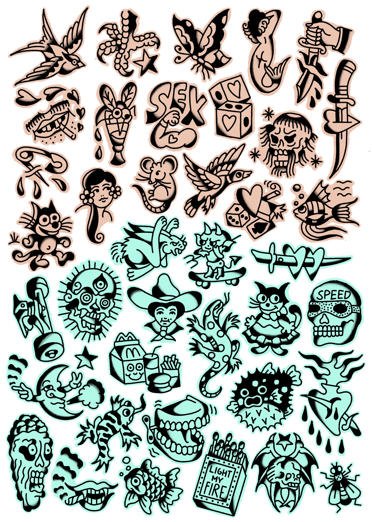 I really love doing large-scale projects, full sleeves and backpieces — but I also have a whole bunch of flash to choose from, if you prefer something small or medium-sized. And I’m always happy to draw custom designs, silly or serious.